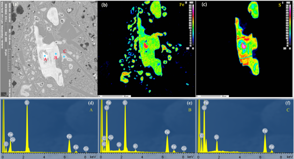 玄武安山岩中硫化物及其溶解产物元素面扫描及能谱图