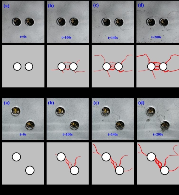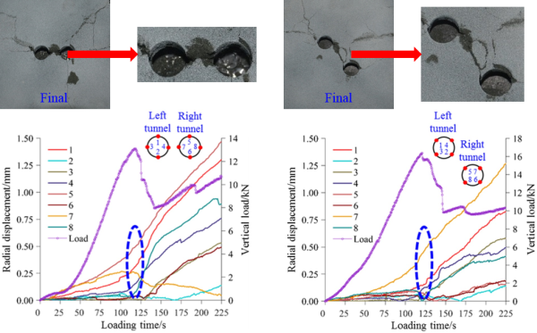 为此,中国科学院武汉岩土力学研究所科研人员针对大型地下工程中广泛存在的多隧洞结构特点,通过3D打印技术制作了2种典型双洞结构布局的物理模型,并在室内开展了针对双隧洞物理模型的水平双向侧限竖向单向加载的超载试验。试验结果完整记录了双洞结构在单向超载工况下的变形破坏过程(图1),并结合超载试验过程加载曲线与双洞内壁特征点位移曲线的变化关系揭示出平行双隧洞结构整体失稳破坏的临界位置处于平行双洞中隔墙的塑性压碎破坏区,非平行双隧洞结构整体失稳破坏的临界位置处于非平行双洞斜向中隔墙的塑性剪切破坏区(图2)。