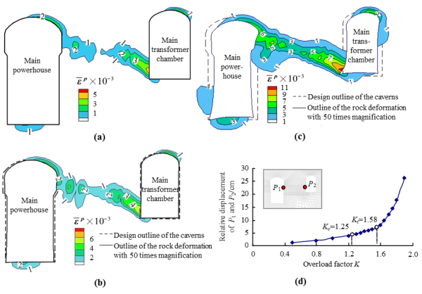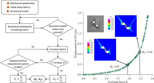 基于试验结果,研究人员进一步提出双隧洞结构整体失稳破坏的稳定性系数定量计算方法,即在双洞超载试验结果与数值反分析交叉验证失稳判据合理性的基础上,建立了基于超载原理的地下多洞室结构整体稳定性区间[KL, KU]的计算方法(图3),并应用于中国西部某水电站地下厂房洞室群的整体稳定性分析,展示了该方法的现实可行性和可操作性。该研究可为地下工程中洞室群的整体稳定性定量评价和支护设计优化提供科学依据。