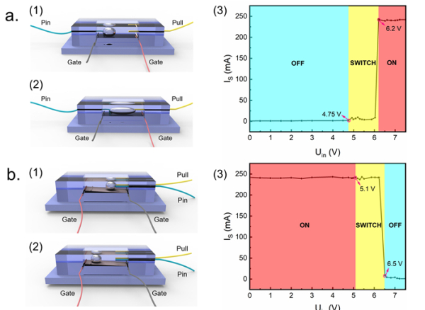 图2.液态金属逻辑器件的工作原理与响应特性曲线