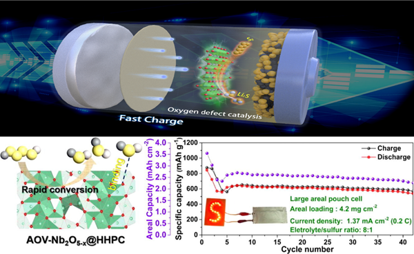 针对上述滞后的多硫化锂转化与锂离子传输动力学问题,中国科学院苏州纳米技术与纳米仿生研究所博士王健与研究员蔺洪振在快速锂离子通道型氧化铌催化剂中引入设阴离子氧空位,结合理论计算,分析了阴离子氧空位催化剂在高面积载量的锂硫软包电池中对多硫离子锚定作用及加速锂离子传导作用,推动了快充电电池的商业化进程。