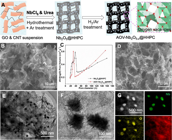 纳米碳负载富含阴离子氧空位氧化铌催化剂(AOV-Nb2O5-x@HHPC)的合成流程如图2,结合了简单水热及后续热处理的方法。电子显微镜发现,制备的纳米氧空位催化剂粒子的尺寸非常小且均匀分布在三维导电网络的纳米碳材料中。研究人员结合XPS与Raman光谱,证实更多的氧空位存在于AOV-Nb2O5-x@HHPC复合材料中。