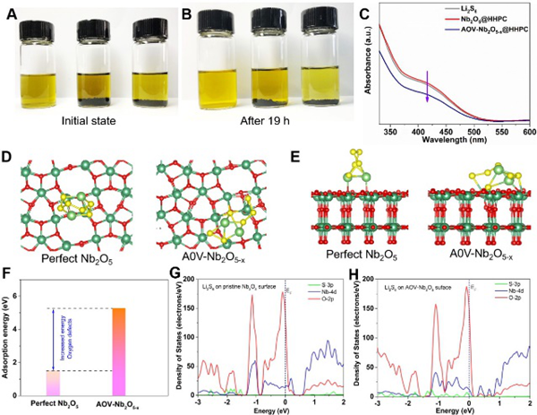图3.基于Nb2O5@HHPC和AOV-Nb2O5-x@HHPC对Li2S6物理吸附光学图片及理论模拟结果