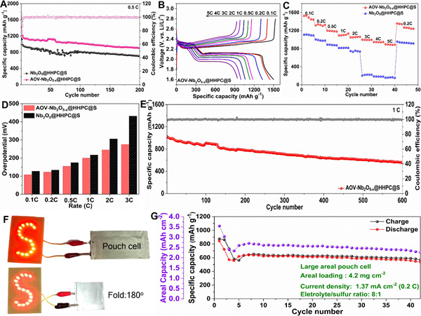 图1.富含阴离子氧空位的AOV-Nb2O5-x@HHPC催化剂的工作机理及锂硫软包电池循环性能