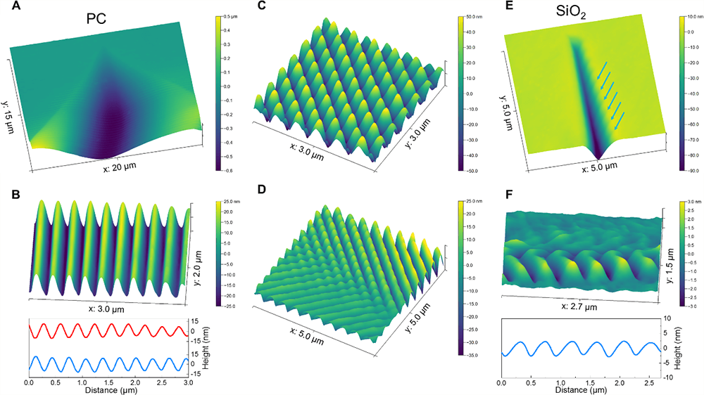 图3.高分子玻璃和氧化物玻璃中空穴行为诱导的断面周期性纳米结构图案。