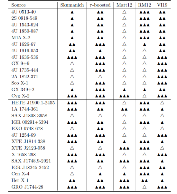表.对比在不同磁制动模型下产生LMXB系统的效率。空心三角表示使用此磁制动模型无法再现该XRB系统,实心三角的数量代表相应磁制动模型下可再现该LXRB效率
