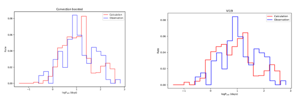 图.计算(红)与观测(蓝)到的BMSP系统轨道周期分布对比。上下两图分别为使用Convection boosted和VI19两种磁制动模型结果