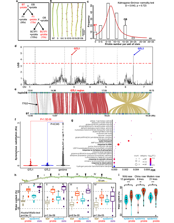 月季花(China Rose)为蔷薇科(Rosaceae)蔷薇属(Rosa)植物,一般指月季(Rosa chinensis)。月季原产我国,但其皮刺发育的遗传机制及其生态学意义未得到明确解析。近期,中国科学院昆明植物所植物分子遗传与适应研究团队与中国西南野生生物种质资源库和云南省农业科学院团队合作,以中国古老月季‘无刺光叶蔷薇’(R. wichuraiana ‘Basye’s Thornless’,BT)和‘月月粉’(R. chinensis ‘Old Blush’,OB)及其杂交F1和回交BC1F1世代遗传群体等为试材,综合利用比较基因组学、分子遗传学和演化生物学等方法手段解析了月季皮刺遗传调控机制,并提出发育早期的皮刺具储水功能的假设。