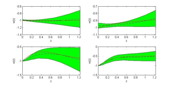重构暗能量状态方程包括参数化和非参数化两类方法。此前的参数化方法有较多局限,造成了对重构结果的人为偏袒,不利于找到明显优于标准宇宙学模型(ΛCDM)的宇宙模型。近日,中国科学院新疆天文台星系宇宙学团组提出了一种新的混合型非参数化方法来重构暗能量状态方程。研究利用拉格朗日插值数值积分来线性化光度距离积分公式,并在岭回归分析的基础上,结合主成分分析和高斯过程形成了新的混合型统计方法。通过模拟数据统计分析,获得暗能量状态方程w(z)随红移的变化(如图),证明了该方法的有效性。科研人员将混合型新非参数化方法应用到最新的Ia型超新星数据JLA(JointLight-Curve)样本中,进行暗能量重构研究,发现单独使用Ia型超新星数据(JLA)时,重构出的暗能量状态方程没有明显偏离ΛCDM模型。该混合型非参数化方法及对JLA数据的应用分析结果发表在《天体物理学杂志》上。