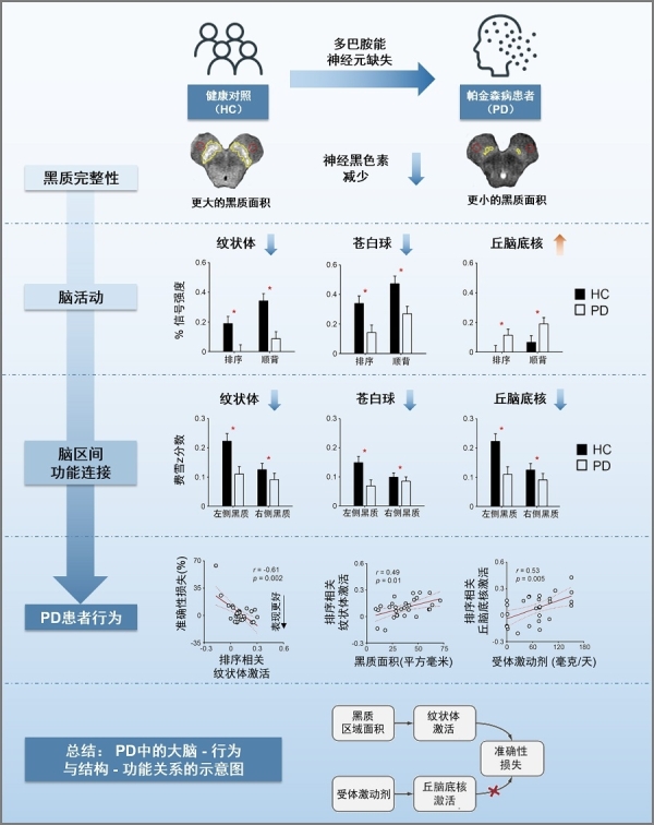 研究发现,与健康对照者相比,PD患者的中脑黑质致密部神经黑色素高信号区域显著减小,说明患者中脑黑质致密部的结构受损。在数字序背任务中,与健康对照者相比,PD患者的丘脑底核激活过高,纹状体和苍白球激活不足,中脑黑质与丘脑底核、纹状体和苍白球的功能连接减弱。在PD患者中,中脑黑质致密部神经黑色素高信号区域越小,与序列加工有关的纹状体激活程度越弱,加工序列信息的能力也越差。临床常用的抗帕金森药物(如多巴胺受体激动剂)虽可调节丘脑底核的激活,却不能有效提高PD患者的序列加工能力。