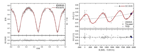 轨道周期的周期性变化说明其在双星系统之外,存在一个类太阳额外天体,在光变曲线分析中额外天体的光度贡献约为2.6%,两者吻合得很好。这进一步说明了双星中第三天体在双星的形成和演化中发挥了重要作用,可能通过相互作用及动力学演化加速中心双星的形成和演化。