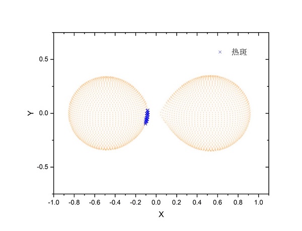 图2.仙王座GK处于0.75位相的几何结构图(其中蓝色区域为物质交流引起的撞击热斑)