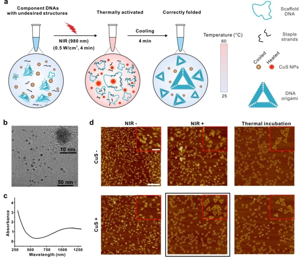 图1.红外光热效应远程、时空控制的DNA Origami的合成。(a)合成的示意图。(b)CuS NPs的透射电镜图。(c)硫化铜的紫外-可见光-红外吸收曲线。(d)各种合成产物的原子力显微镜图。