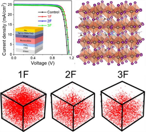 该研究中探索了在氟乙胺分子中,氟原子个数对梯度钝化钙钛矿薄膜缺陷的影响,以及对调控薄膜光电性质、钙钛矿电池效率和稳定性的影响;ToF-SIMS研究发现,包含不同氟原子个数的添加剂在薄膜中呈现梯度分布,能够钝化薄膜不同位置的缺陷,其中,一氟乙胺实现了从体相到表面的整体钝化,可将钙钛矿电池效率从22.2%提高到23.4%。