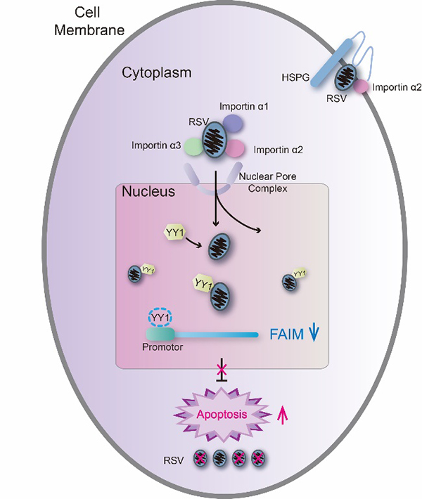 Importin α家族介导RSV入核引发抗病毒反应和帮助RSV侵染唾液腺细胞的模式图