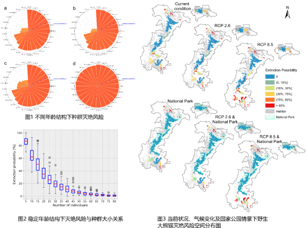 该研究揭示了野生大熊猫种群个体数量与灭绝风险的关系,评估了每个野生大熊猫种群的灭绝风险及其空间分布。研究发现,在不考虑偷猎、采伐、放牧、竹子开花、自然灾害和其他人类活动等外部环境因素影响下,100年内,有18个种群的灭绝风险高于50%,15个种群的灭绝风险高于90%。如果种群年龄结构趋于老龄化或幼崽存活率降低,灭绝风险会进一步明显升高。