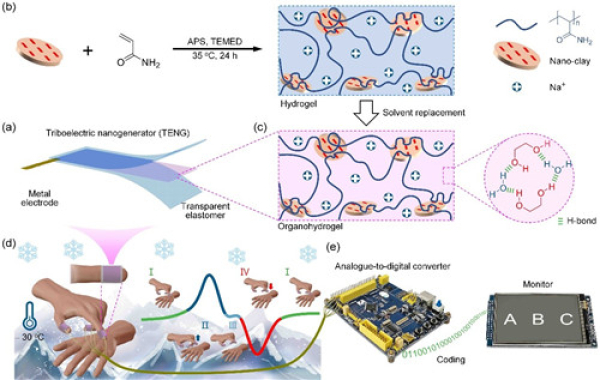 便携、柔性的人机交互器件在物联网、智能机器人等领域具有重要作用,用户能够通过它们完成与系统的信息交换,或向系统发送指令。受生命体通过离子定向迁移传递生理电信号的启发,离子导电水凝胶材料被广泛应用于设计制作柔性可拉伸电子器件。然而水凝胶中的水在低温环境下会结冰,导致材料变脆,离子电导率下降,制约了其适用温度的范围。如何设计耐低温柔性导电凝胶,并在此基础上制作具有广泛应用前景的智能人机交互器件仍是一个挑战。
