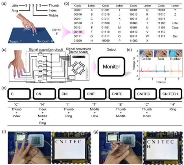 该工作通过溶剂置换的方法设计了一种由聚丙烯酰胺、纳米粘土交联网络和乙二醇、水二元溶剂为分散介质组成的有机凝胶(图1)。纳米粘土在作为物理吸附交联点的同时还提供了可移动的自由离子,使其具有离子导电性。乙二醇的引入赋予了该有机凝胶良好的抗冻性能,包括-0℃下良好的可拉伸性(700%)、离子电导率(1.5×10-3 S m-1)、透明度(91%)以及自修复性。进一步以有机凝胶为电极与弹性体组装制备了摩擦纳米发电机(TENG),得益于有机凝胶良好的抗冻性能,该有机凝胶TENG在-30℃仍保留了良好的发电性能。研究人员将其进一步附着在手指上,开发了一种可穿戴的人机交互键盘。TENG在与其他物体接触分离的过程中能够产生相应的电压信号,这些电压信号被收集、编码,最终能够将对应文字信息显示在显示器上(图2)。该工作为凝胶材料在人机交互领域的应用提供了新的思路。