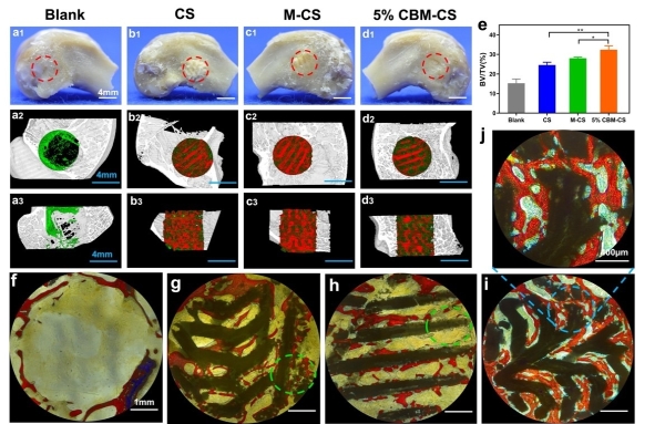 图3 微生物催化活性矿物形成在三维支架上诱导骨形成。(a1-d1) 在兔子骨缺损中植入12周后缺损处宏观形貌;(a2-d3) Micro-CT分析的横切面和纵剖面的3D图;(e) 新生骨评价BV/TV; (f-i) 硬组织切片;(j) 低倍数照片