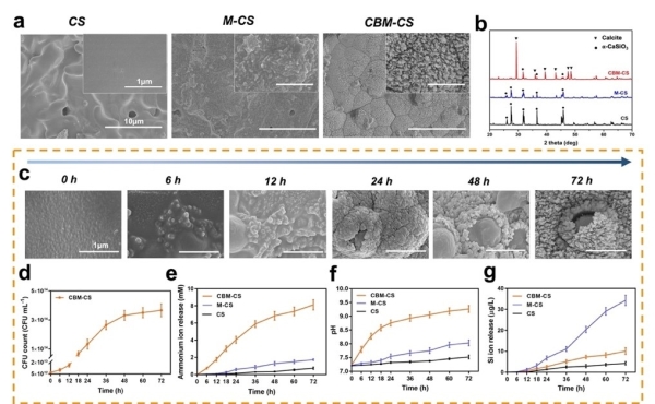 图2 (a) 微生物在硅酸钙陶瓷表面催化的微纳米碳酸钙结构;(b) 微生物修饰陶瓷表面的XRD分析;(c) 微生物催化表面微纳米结构的过程; (d-g) 微生物处理陶瓷材料的过程中溶液各组分的变化,d)细菌增殖,e)代谢产物NH4+的浓度,f)溶液中pH变化,d)陶瓷材料中Si离子的释放