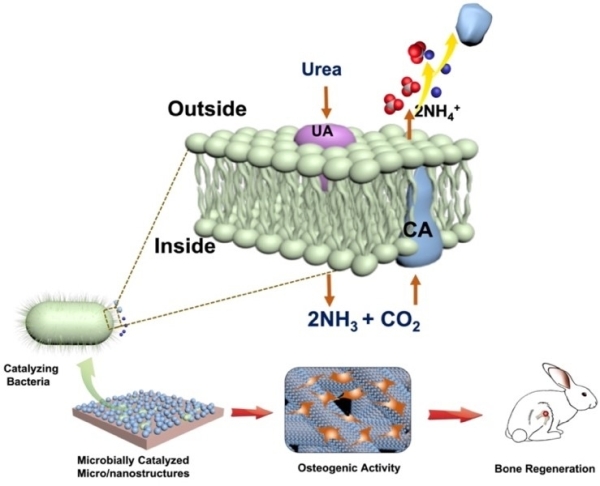 研究团队利用产脲酶菌(S.cohnii)的代谢作用在陶瓷材料表面诱导出均匀的生物矿化层(图2)。在这个过程中,微生物首先粘附在基底陶瓷表面,在脲酶和碳酸酐酶的催化下提升微环境中的pH与CO32-浓度。同时,细菌细胞壁表面的负电性基团吸附Ca2+,促进碳酸钙颗粒的结核与生长。微生物在陶瓷材料表面构建的纳米碳酸钙矿物明显抑制了硅酸钙陶瓷的快速降解,并对骨髓间充质干细胞的粘附、铺展、增殖、迁移和分化等细胞生物活性具有更好的促进作用。在皮下植入和大块骨缺损修复动物实验中,微生物催化的表面生物材料具有良好的生物相容性,表现出显著的促骨组织再生的优良生物活性(图3)。微生物催化的生物活性材料用于骨组织再生是一种微生物与组织工程相结合的新方法,这种策略为生物医学材料的制备提供了新思路。