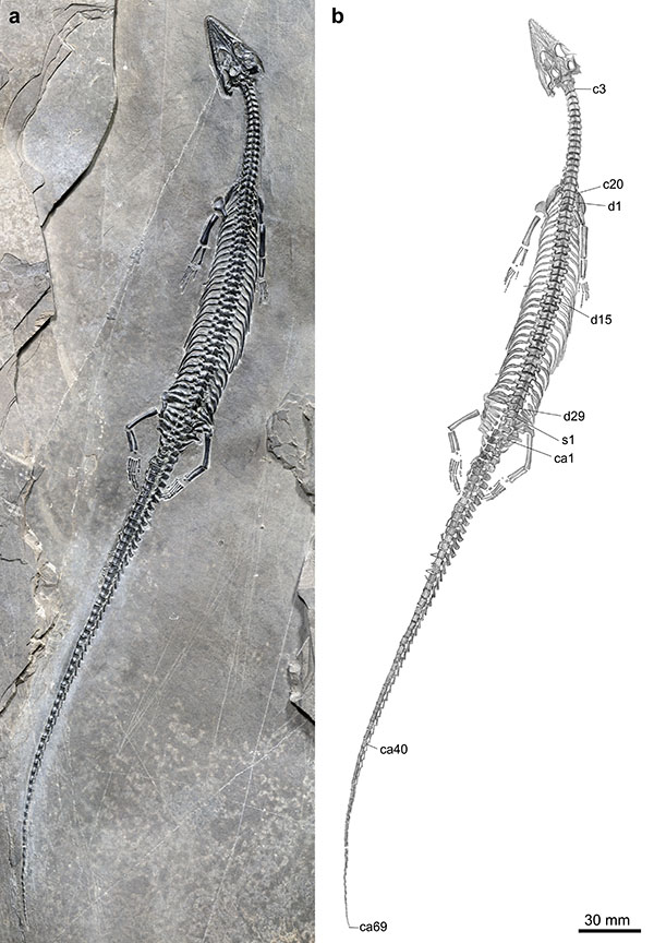 近日,以中国科学院古脊椎动物与古人类研究所研究员徐光辉为主导的研究团队在《科学报告》(Scientific Reports)上,报道了距今约2.44亿年前一个海生爬行动物新属种——长尾红河龙。长尾红河龙发现于我国云南省红河州泸西县中三叠世早期海相地层,全长47厘米,体形像水生蜥蜴,超长的尾巴尤其特别。长尾红河龙是我国肿肋龙科最早的确切证据,代表了世界上尾巴相对最长(由69块脊椎骨组成)、脊椎骨总数最多(121块)的肿肋龙类。