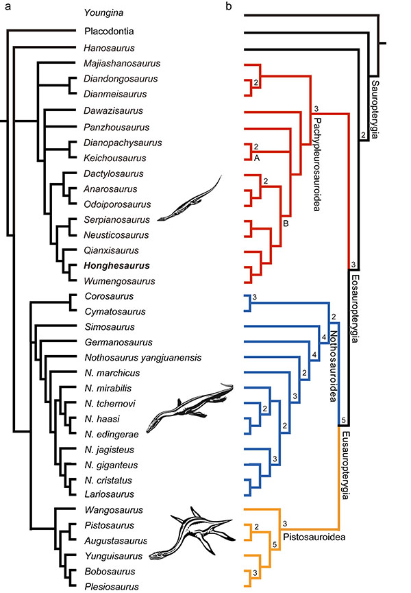 二叠纪末生物大绝灭之后,海洋生态系统在三叠纪发生了重大变革,爬行动物在海洋环境中辐射演化,形成以鱼龙类、海龙类与鳍龙类(包括楯齿龙类、肿肋龙类、幻龙类和蛇颈龙类)等为代表的海生爬行动物支系。华南三叠系海相地层分布广泛,保存有数量多、门类丰富的海生爬行动物化石,为探究当时海洋生态系统的构成、食物网和营养级提供了良好条件。研究表明,红河龙与此前发现的乌蒙龙和黔西龙相似,但它的牙齿外表面比较光滑、齿冠没有明显的膨大,与后两者显著不同,这可能反映了它们之间的食性差异。