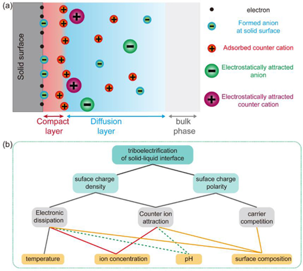 影响固-液界面摩擦起电的因素众多,导致科学家对固液界面摩擦起电机理与本质的认识尚未统一。科研团队通过建立固液界面的新模型,探究摩擦起电机制与界面双电层的内在关系,研究温度耗散、液体离子浓度、pH导致的反离子吸附、表面组分等因素的影响,揭示了电子转移和离子转移在固-液界面起电中的共同作用(图1)。为进一步通过调控润滑介质组分,实现机械装备中摩擦界面的静电防护提供了理论和技术支持。此外,科研人员还研究了油-固摩擦界面的摩擦起电行为,揭示油润滑界面摩擦起电与润湿性的关系,阐释润滑油性质与摩擦起电的关系,设计了基于摩擦电的润滑品静电预警及油润滑界面乏油状态预警系统。相关研究成果发表在Nano Energy(2022,104,107900;2022,104,107930;2020,78,105370)、Tribology International(2022,165, 107323)上。