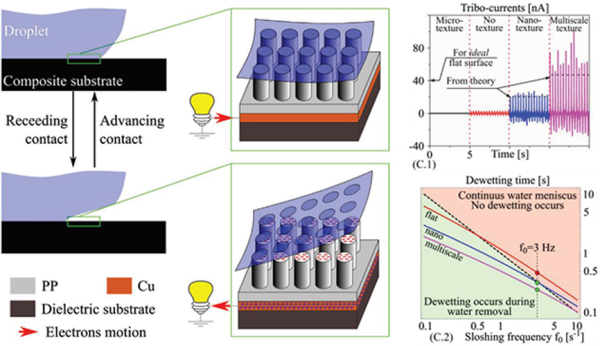 表面润湿行为是影响固-液摩擦起电的另一重要因素。科研团队通过设计材料表面结构、组分、界面接触等因素,系统探究了固-液界面润湿性、黏附、界面接触与摩擦起电的相互关系。研究通过固-液摩擦起电准确地量化和跟踪了润湿动力学(图2),进而原位揭示了表面微观结构调控润湿转变行为的机制。此外,科研人员还根据PCL构象变化与摩擦电学行为之间的密切相关性,利用液-固摩擦电信号研究了两亲性聚合物的表面重构行为,探索了固-液摩擦起电在界面润湿性监测和智能润滑检测等领域中的潜在应用。相关成果发表在Advanced Science(2022,9,e2200822)、Advanced Functional Materials(2021,31,2010220;2019,29,1903587)上。