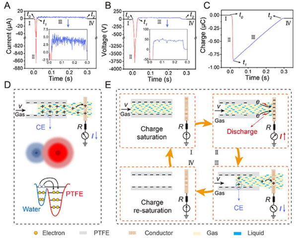 近日,科研团队利用一种类似文丘里管的结构,通过耦联摩擦起电效应与击穿放电效应,研究气体-液体两相流与固体界面的摩擦起电行为。科研人员利用流体的流变学性能,解决了固-液在摩擦起电收集过程中接触面积小、接触分离速度、输出性能低等问题,实现了用1.0 mL水获得3789V和867μA瞬时电流和电压输出的新纪录,分别是传统设计的1890和430倍(图3)。在微观的电荷转移机理方面,科研团队基于密度泛函理论(DFT)建立模型对固-液界面的电荷转移进行仿真模拟,利用专业的流体仿真软件和高速摄像机对气液两相流在固体器件内的动力学特性进行分析。该研究对认识多相流与固体界面间的摩擦起电行为以及机械运动过程中高速油液的静电防护颇具意义。相关研究成果以Gas-liquid two-phase flow-based triboelectric nanogenerator with ultrahigh output power为题,发表在《科学进展》(Science Advances)上。