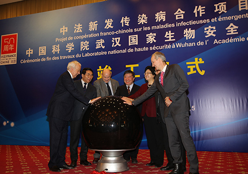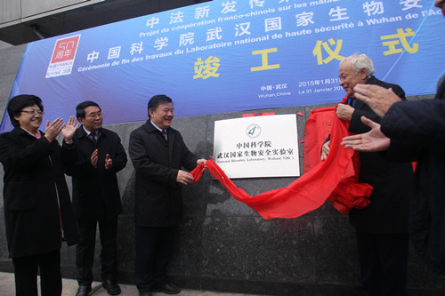 1月31日,中国科学院武汉国家生物安全实验室(即武汉P4实验室)竣工仪式在武汉市举行。本次活动由中科院和国家卫生和计划生育委员会共同举办,中科院武汉病毒研究所具体承办。全国人大常委会副委员长、农工党中央主席陈竺,国家卫计委主任李斌,中科院院长、党组书记白春礼,湖北省委副书记、省长王国生,法国政府与议会关系事务国务秘书让-马力﹒勒甘,法国梅里埃基金会主席阿兰﹒梅里埃出席并致辞。仪式由中科院副院长张亚平主持,来自国家卫计委、中科院、科技部、外交部、农业部、国家质检总局、中国合格评定国家认可委员会、法国梅里埃基金会、法国国家医学与健康研究院、法国巴斯德研究院等中法新发传染病合作项目成员单位及世界卫生组织(WHO)驻华代表处的代表共计200余人参加了活动。