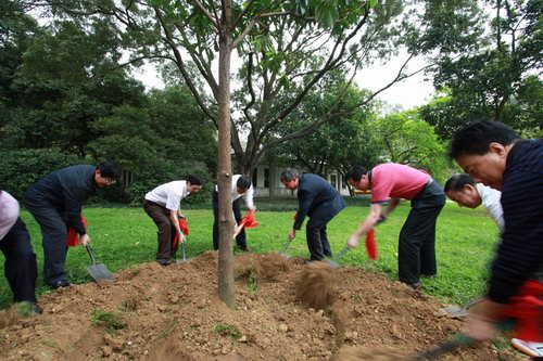参观途中,汪洋一行还在华南植物园的“名人植树区”开展了植树活动,他和植物园领导共同种下了一颗高大的珍稀植物——油丹( Alseodaphne hainanensis Merr.)。