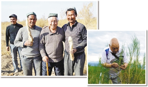 上图 刘铭庭(左三)与肉苁蓉种植户合影。(资料图片) 下图 刘铭庭在野外考察红柳。(资料图片)