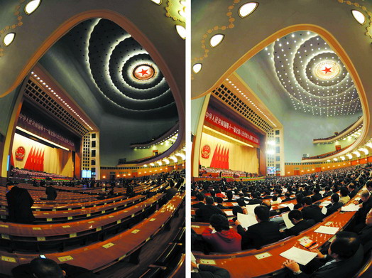 左图:3月11日,十一届全国人大三次 会议第四次全体会议开始前,大礼堂内灯光仅有部分点亮,以节约电力。