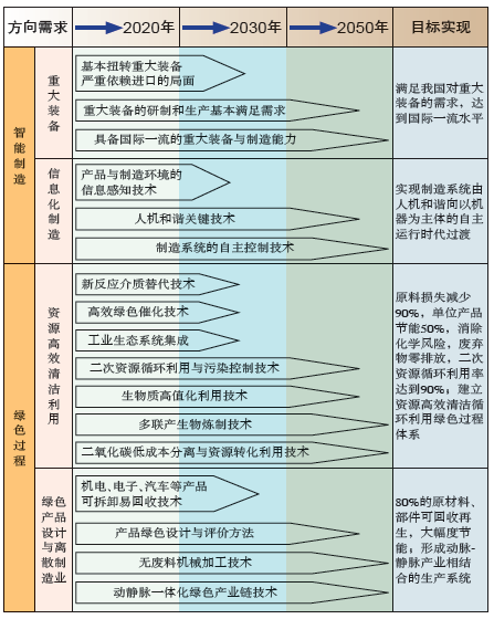 围绕智能制造和绿色过程,重点解决物质高效转化和工程放大、海量制造信息处理模式和与智能制造方法等两个核心科学问题,突破资源高效清洁循环利用、绿色产品设计、重大装备设计与制造、智能控制等四个方面的关键技术,推动相关技术的商业化应用。具体安排是:至2020年,揭示资源高效利用的物质转化多尺度机制和工程放大原理,重点突破新反应介质替代技术,高效绿色催化技术,资源循环与过程环境技术,过程量化放大与生态工业/循环经济系统集成技术,机电、电子和汽车产品可拆卸易回收技术等,研发过程强化与先进反应分离设备。突破重要装备的可预测性维护技术和产品与制造环境的信息感知技术。至2030年,建立产品绿色设计与评价方法,突破大宗废弃物二次资源循环利用与污染控制技术,生物质高值化利用技术。完善产品可靠性设计方法,突破机器与人相互适应的关键技术,建立以人为主要决策核心的人机和谐系统。至2050年,建立资源多级循环优化利用方法体系,广泛应用产品绿色设计与全生命周期评价,突破多联产生物质加工炼制技术,二氧化碳低成本分离与资源转化利用技术、离散制造业的无废料机械加工技术,动静脉一体化绿色产业链技术,形成循环社会和低碳经济新模式的先进技术体系。突破制造装备的自主控制技术,形成智能制造系统。