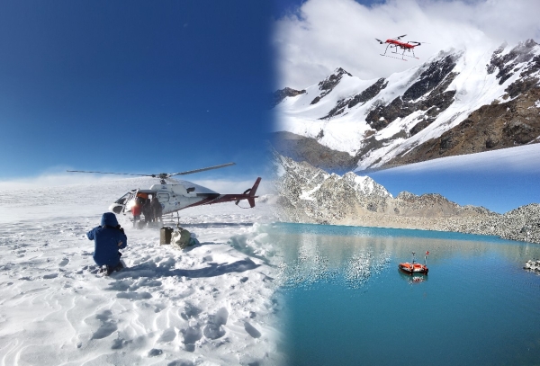 利用直升飞机运载科考设备到极高海拔冰面作业,利用无人机观测冰川地形,利用无人船测量湖泊水量