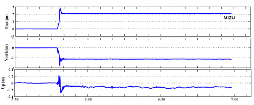 离震中距离140KM的MIZU站的动态位移,从上开始依次为东西,南北和垂直方向,可以看到由于地震引起的永久位移在东西方向最大,达到2米左右。