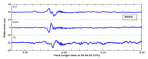 离震中距离2088KM的中国上海SHAO站的动态位移,从上开始依次为东西,南北和垂直方向,可以看到由于地震引起的动态位移振幅也有7,8个厘米。图中横坐标为时间,原点为地震发生时刻。