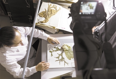 图为7月4日,在中科院植物研究所植物标本馆,工作人员用数码相机拍摄一份植物标本。新华社记者 金立旺摄
