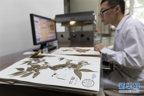 7月4日,在中科院植物研究所植物标本馆,工作人员扫描一份植物标本。新华社记者金立旺摄