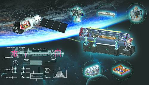 科研人员在空间微重力环境下利用激光把铷原子温度降低到接近绝对零度,利用激光和高精度微波场对制备的冷原子进行操纵和探测,提取出铷原子高稳定的能级跃迁频率作为高精度原子钟信号,在国际上首次实现了冷原子钟的在轨稳定运行。