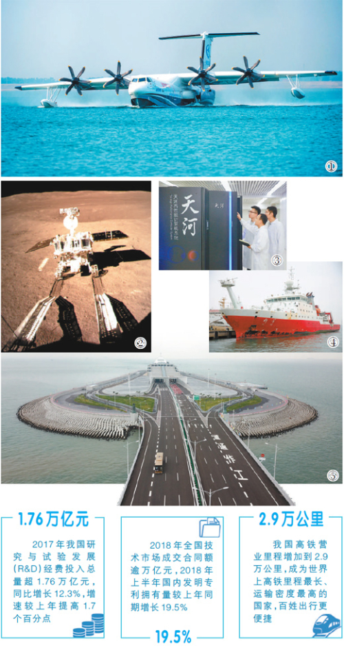 图①:国产大型水陆两栖飞机AG600。新华社记者熊琦摄 图②:嫦娥四号登陆月球背面。新华社发 图③:天河三号E级原型机部署启用。资料照片 图④:“科学”号完成科考任务返回青岛。张进刚摄 图⑤:港珠澳大桥人工岛。新华社记者 吕小炜摄