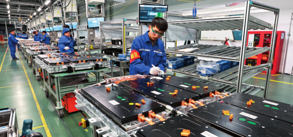 在上汽时代动力电池 系统有限公司车间,工人在 安装新能源汽车动力电池 系统(2023年2月16日摄) 杨磊摄 / 本刊