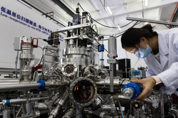 科研人员在综合极端条件实验装置(怀柔)低温原位扫描隧道-角分辨光电子谱实验站放置实验样品。新华社记者 金立旺 摄