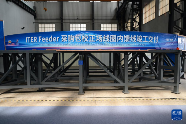 这是竣工待交付的最后一套国际热核聚变实验堆(ITER)超导磁体校正场线圈内馈线部件(4月11日摄)。 新华社记者 周牧 摄