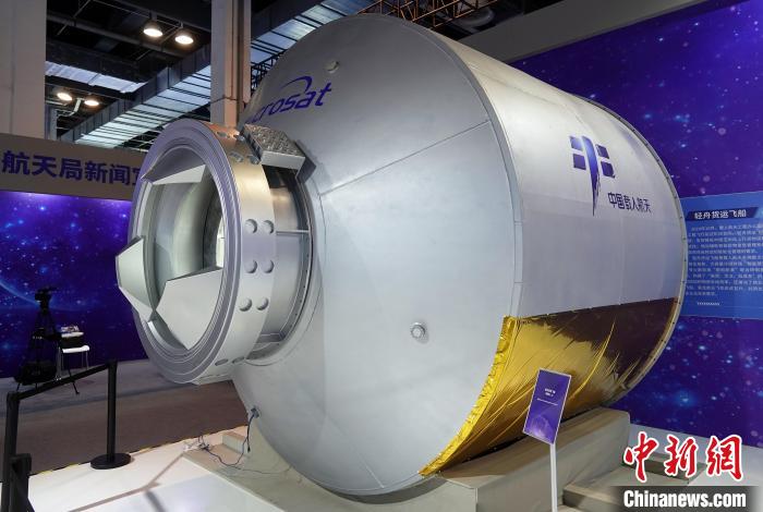 轻舟货运飞船首次亮相,其1:1模型参展2025年“中国航天日”科普展。中新网记者 孙自法 摄