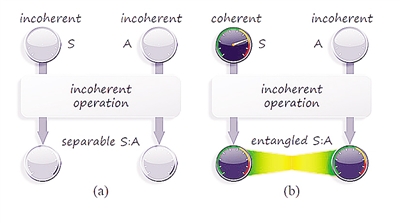 (a)两个输入态(S和A)都是不相干的,无法通过非相干操作转化为纠缠;(b)输入态S有非零相干,这种相干可以通过非相干操作转化为纠缠。新结果表明,在这种情况下,输入相干和输出纠缠在数量上是相等的。