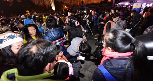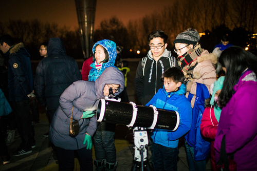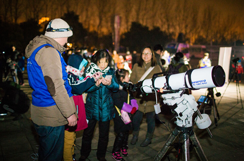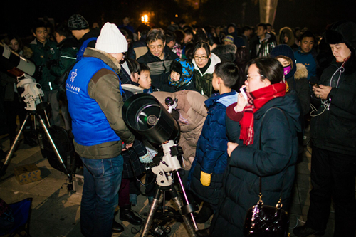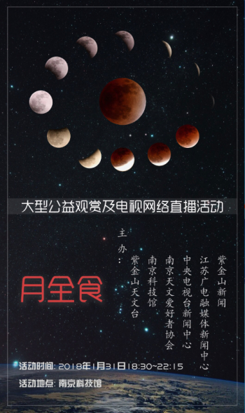 活动当天下午,紫金山天文台和南京天文爱好者协会在广场上架设好二十多架天文望远镜和观测设备,准备全面记录这场天文奇观。中央电视台、江苏卫视等媒体的直播车开到活动现场,共同为亿万电视观众和广大网友实时直播。大雪过后的南京零下8度,寒冷的天气并未阻挡人们的观测热情,晚上六点左右,从四面八方赶来的市民陆续来到南京科技馆。随着月食时间的临近,广场上的人越来越多。19点30分,江苏广播电视台开始进行活动直播。两架天文望远镜将月球的近景实时投射在巨大的显示器上,紫金山天文台老师葛永良作为特邀嘉宾,对月全食的每个阶段进行详细解说。期间,葛永良通过太阳系模型对月全食的原理进行演示,并与广大网友和现场观众进行互。紫金山天文台老师刘炎先后接受了中央电视台、中国新闻社、《新华日报》、东方卫视、南京电视台等多家媒体的采访。同时,广场另一边的观测区域人山人海。每个望远镜被等待观测的人群围得水泄不通。透过望远镜的目镜,月球的细节一览无余。紫金山天文台陈向阳、胡方浩、樊莉平、王科超、周团辉及研究生志愿者,以及南京天文爱好者协会会员指导观测,解答疑问。公众在欣赏美景的同时,收获了天文知识。在人们的注视和期待中,月全食在不紧不慢地进行着。19点48分初亏,月亮的一角被“咬掉”了,1/3被遮住了,一多半被遮住了,20点51分食既到来,整个月亮被完全遮住,在接下来的一个多小时里,满月已经没有了皎洁的光芒,而是呈现出红彤彤的面貌来。现场听到人们的欢呼、尖叫,整个广场充满了人们对这一天文奇观的感叹。