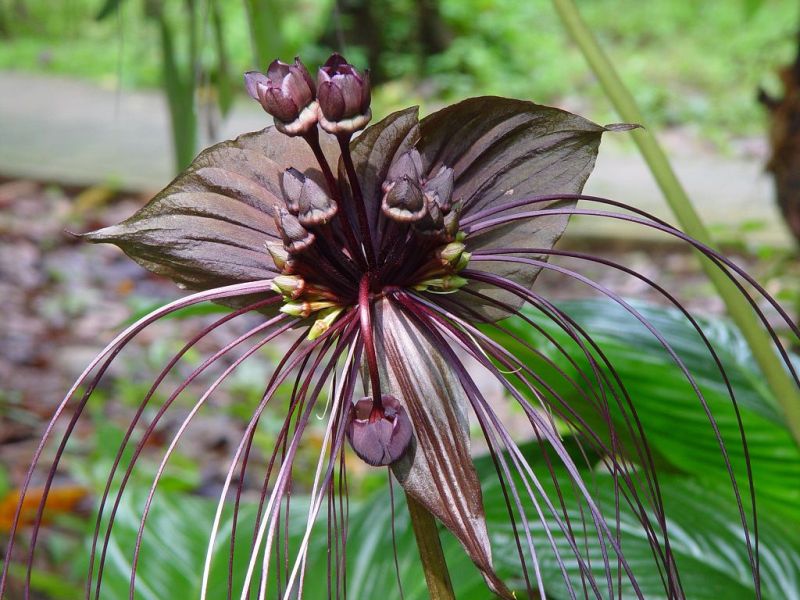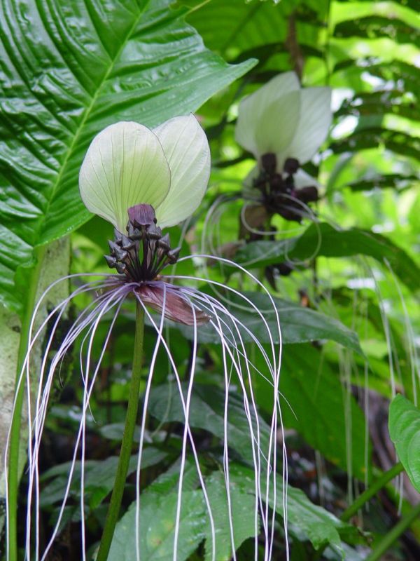 神奇美丽的西双版纳因其至今还保存着大面积热带雨林而享誉世界,在这郁郁葱葱的浩瀚林海中蕴藏着许多神奇的植物,其中有一种被称为“老虎须”的奇花一定会让你过目难忘。瞧它那下垂的丝状小苞片,长达几十厘米,形如胡须,整个花序看上去就象一张呲牙咧嘴的老虎的脸;另外,它的花序拥有两片垂直排列的紫黑色的大苞片,又使整个花序活象一只飞舞的蝙蝠;再加上它独具晦暗颜色,在阴暗的热带雨林下面咋一看不禁让人感到毛骨悚然,因而,它除了被称之为“老虎须”外,还有“蝙蝠花”或“魔鬼花”等别名。其谜一样的花展示,相信会让每一个在热带雨林中邂逅到它的人感到诧异并为之浮想联翩。
