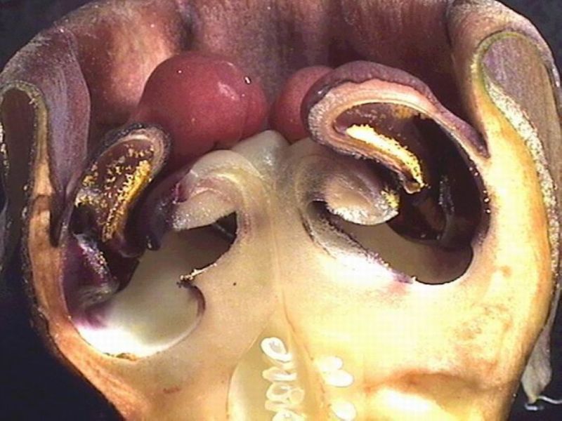 然而,“老虎须”的花在其它一些特性上似乎又很难得到忙碌的蜜蜂和花枝招展的蝴蝶的青睐:暗淡的色彩、没有香气、不分泌大多数传粉动物喜欢的花蜜,就连产生后代必不可少的花粉也少的可怜,如果它那飘逸的胡须和发达的苞片能够远距离吸引传粉动物的话,那它又是靠什么来近距离引导这些动物并给它们提供回报的呢?曾经,科学家们根据“老虎须”似是而非的形态和结构推测这类植物可能通过释放一种我们无法嗅到的腐烂有机物气味,以吸引热带雨林下面的各种苍蝇,进入它那狭窄迂回、迷宫一样的花冠里面为其进行传粉,从而将“老虎须‘归类到腐臭气味传粉综合症群(sapromiophily)中,认为花颜色的隐晦和大而显著的花序等特征很可能与苍蝇传粉有关——这也就是我们提出的假设。